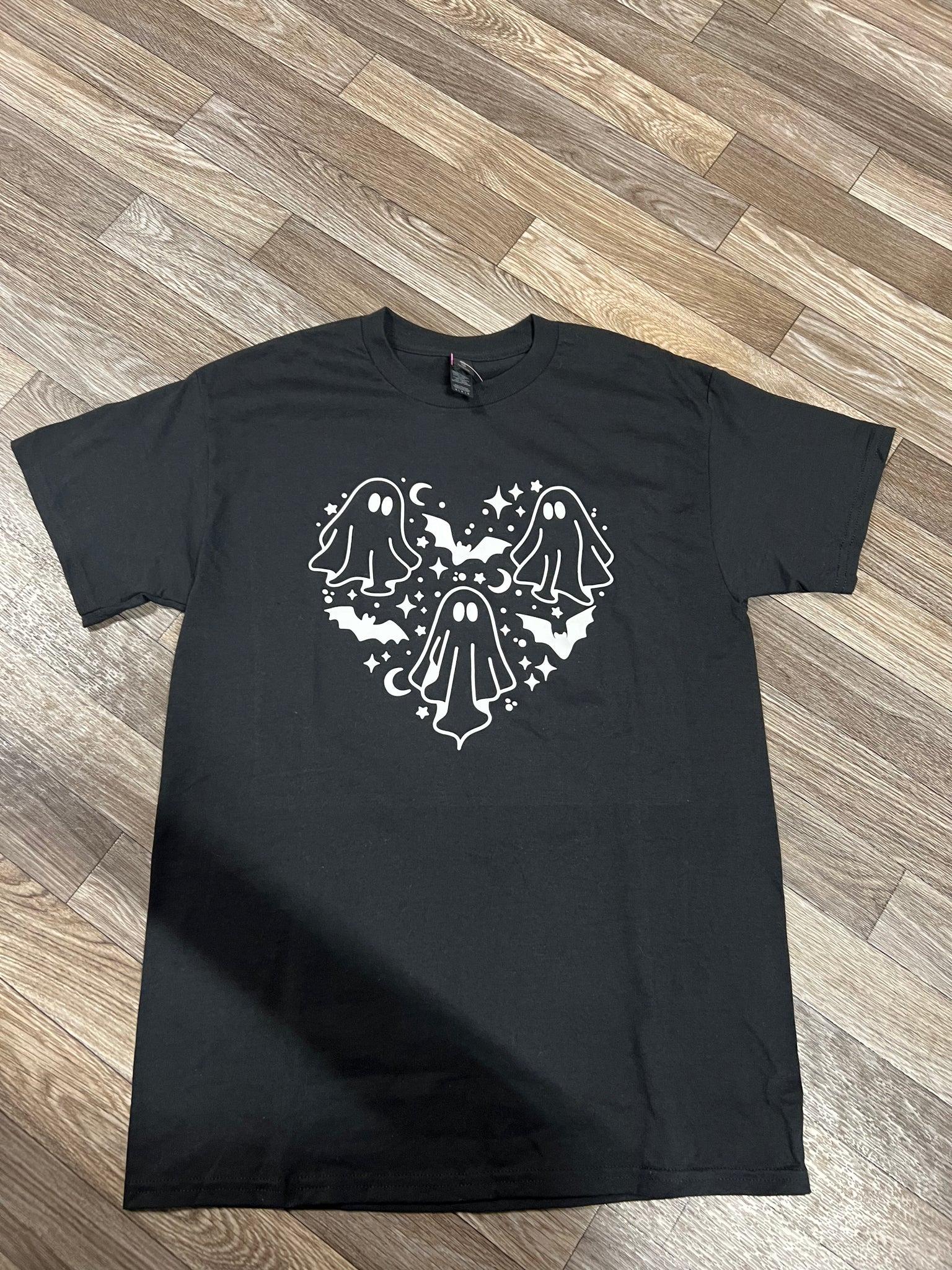 Black Tshirt featuring ghosts in the shape of a heart! Perfect for halloween! Pair it withy our favorite jeans or over a basic dress. Sizes will go fast so get yours today!