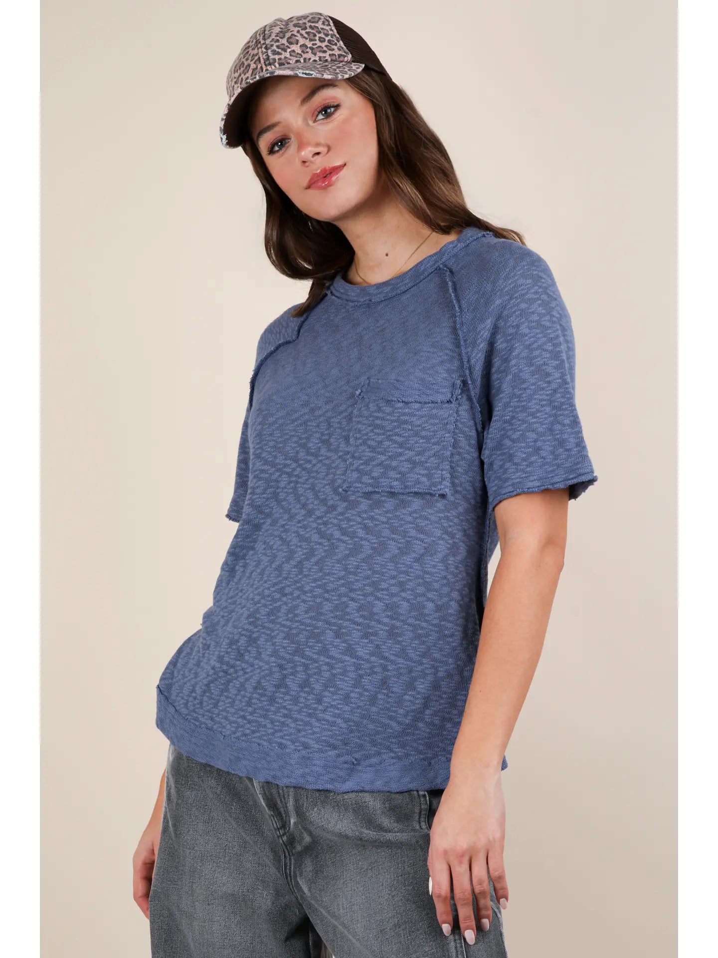This blue solid casual knit top features a convenient patch pocket, a comfortable round neckline, and short sleeves. The frayed hem detail adds a stylish touch, making it perfect for everyday wear. Pairs so well with your favorite jeans or capris!